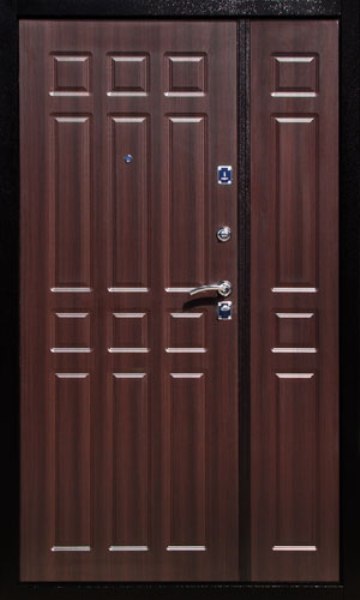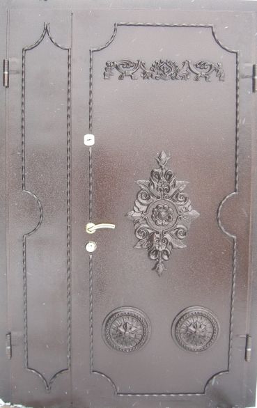 Двери двустворчатые входные металлические имеют сложную конструкцию, включают в себя множество дополнительных элементов, накладок и вставок. На такую дверь будет потрачено больше материала отделки, что также отразится на итоговой стоимости.